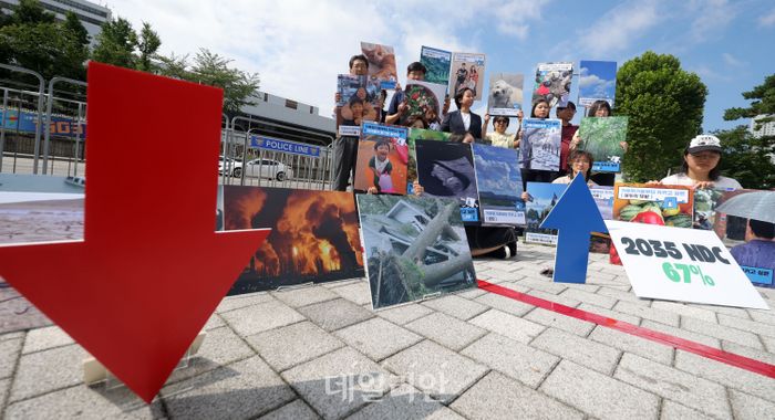 기후위기비상행동 회원들이 2일 서울 용산구 대통령실 인근에서 기자회견을 열고, 716개 시민들의 목소리를 담아 이재명 정부에 2035년 국가 온실가스 감축목표(NDC)를 2018년 대비 최소 67% 감축으로 설정할 것을 촉구하는 퍼포먼스를 하고 있다. ⓒ뉴시스