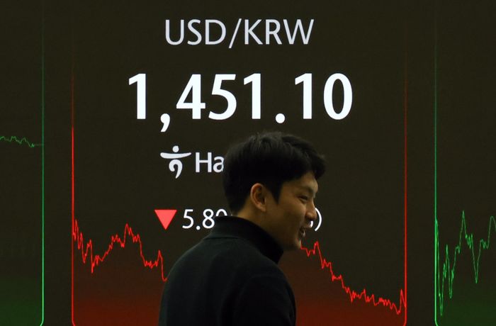서울 외환시장에서 원·달러 환율이 전 거래일 주간거래 종가(1456.9원)보다 5.5원 내린 1451.4원에 주간 거래를 마감한 10일 서울 중구 하나은행 딜링룸에 환율 시세가 보이고 있다. ⓒ뉴시스