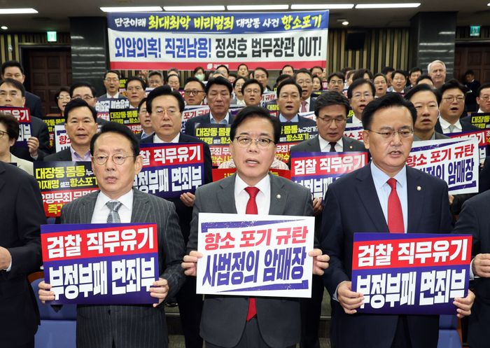국민의힘은 10일 오후 의원총회를 갖고 검찰의 대장동 사건 항소 포기와 관련해 정성호 법무부 장관과 노만석 검찰총장 권한대행의 사퇴를 촉구했다.