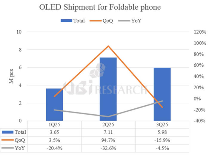 올해 1~3분기 누적 출하량은 1670만 대로, 전년 동기(2100만 대)보다 약 20% 감소했다. 연간 기준으로도 2025년 폴더블 OLED 출하량은 2130만 대에 그쳐, 전년 대비 14.4% 감소할 전망이다.