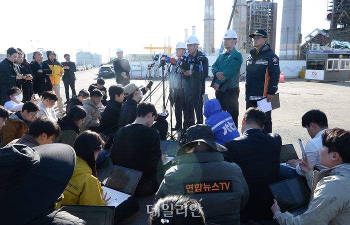 지난 10일 오후 오영민 고용노동부 안전보건감독국장이 울산화력발전소 붕괴사고 현장에서 브리핑을 하고 있다. ⓒ뉴시스