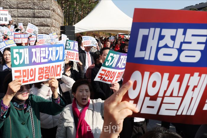 12일 오전 서울 여의도 국회 본청 앞 계단에서 열린 국민의힘 '대장동 일당 7400억 국고 환수 촉구 및 검찰 항소포기 외압 규탄대회'에서 참가자들이 구호를 외치고 있다.