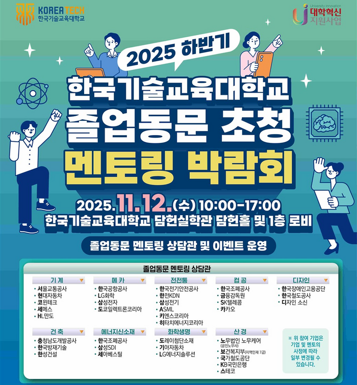 한국기술교육대학교는 12일 교내 담헌실학관 일대에서 ‘2025 하반기 졸업동문 초청 멘토링 박람회’를 개최했다.