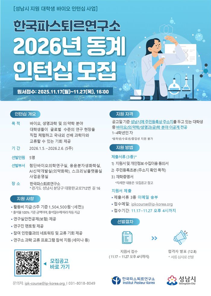 인턴십은 2026년 1월 5일부터 2월 6일까지 5주간, 성남시 분당구 소재 한국파스퇴르연구소(Institut Pasteur Korea)에서 진행된다. 참가 학생들은 질병 연구, 신약 개발, 감염병 대응 등 바이오헬스 핵심 연구 분야의 실제 연구 환경을 경험하게 되며, 연구진의 멘토링과 과학 세미나, 연구 교류 프로그램에도 참여할 기회가 주어진다.
