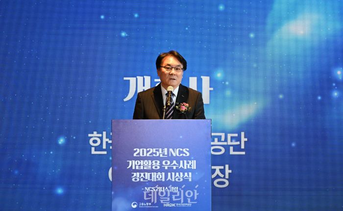 고용노동부와 한국산업인력공단은 14일 서울 중구 신라호텔에서 ‘2025년 국가직무능력표준(NCS) 기업활용 우수사례 경진대회’ 시상식을 개최했다. 사진은 이우영 한국산업인력공단 이사장이 개회사를 하는 모습. ⓒ고용노동부