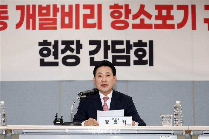 장동혁 국민의힘 대표가 14일 오후 경기도 성남시 분당구 성남도시개발공사 1층 대강당에서 열린 '대장동 개발비리 항소 포기 규탄 현장간담회'에서 모두발언을 하고 있다.