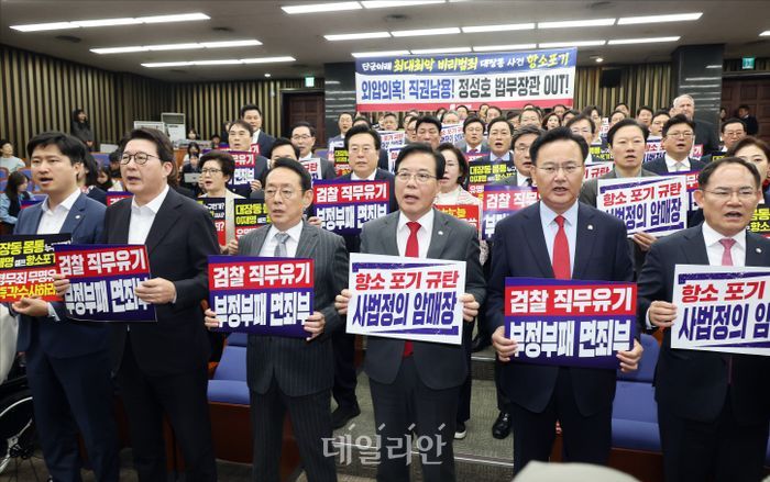 송언석 국민의힘 원내대표를 비롯한 의원들이 10일 오후 서울 여의도 국회에서 열린 국민의힘 의원총회에서 '대장동 재판 항소 포기' 관련 피켓을 들며 규탄 구호를 외치고 있다.