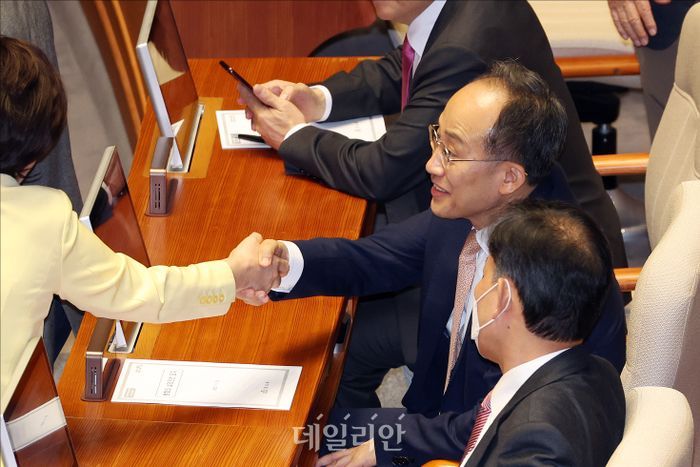 추경호 국민의힘 의원이 13일 오후 서울 여의도 국회 본청에서 열린 국회 본회의에서 동료 의원과 인사를 나누고 있다.