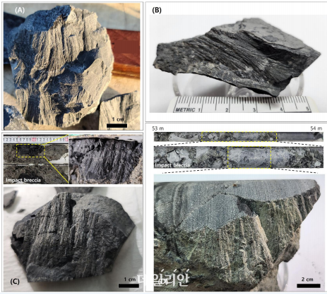 합천운석충돌구 시추코어 130m 심도에서 확인된 충격원뿔암(shatter cone).ⓒ한국지질자원연구원