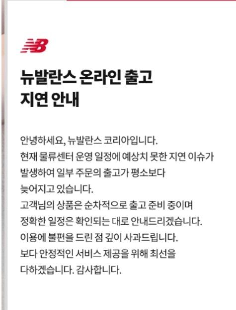 이랜드월드가 국내에 유통하는 뉴발란스는 홈페이지에 "현재 물류센터 운영 일정에 예상치 못한 지연 이슈가 발생해 일부 주문의 출고가 평소보다 늦어지고 있다"며 "상품은 순차적으로 출고 준비 중"이라고 공지했다.
