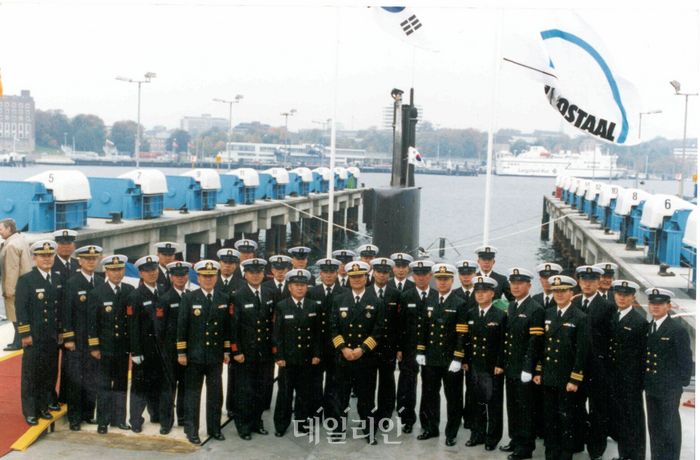 1992년 10월 14일 독일 HDW 조선소에서 열린 장보고함 인수식에서 인수 승조원들이 기념 촬영하는 모습. ⓒ해군