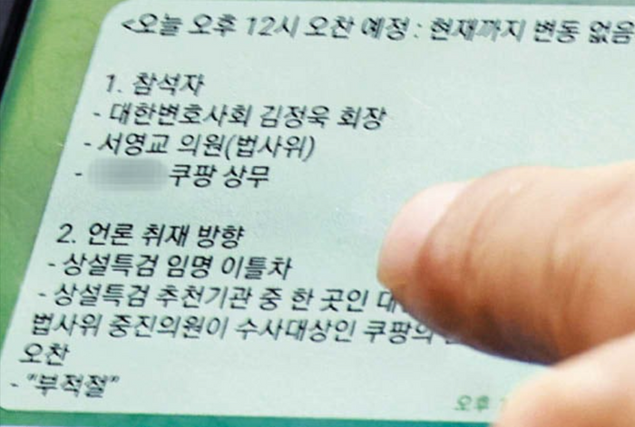 서 의원의 이른바 쿠팡 임원 오찬 일정은 김병기 민주당 원내대표의 문자를 통해 공개됐다. 전날 오전 국회 운영위원회 전체회의에서 김 원내대표가 보고 있던 오찬 관련 문자가 한 언론사의 카메라에 포착된 것이다. 김 원내대표 보좌관이 보낸 것으로 알려진 이 문자는 김정욱 대한변협 회장과 서 의원, 쿠팡 상무 A씨가 18일 오찬에 참석한다는 내용이었다.