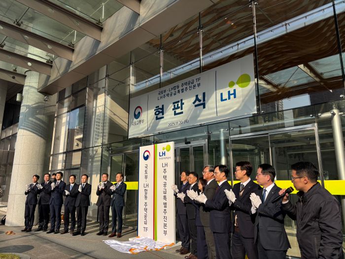 김윤덕 국토부 장관은 20일 서울 용산구 HJ중공업 본사에서 개최된 국토부-LH 합동 주택공급 TF 및 LH 주택공급특별본부 현판식에 참석해 “국토부와 LH가 원 팀이 돼 주택 공급에 힘을 모으는 첫 걸음”이라고 강조했다.