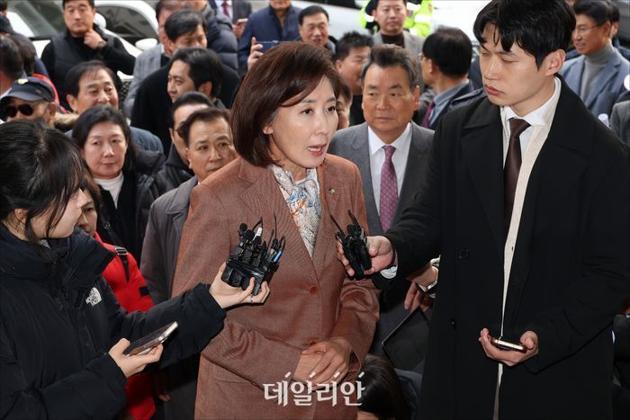 자유한국당 원내대표였던 나경원 국민의힘 의원이 20일 오후 서울 양천구 서울남부지방법원에서 열린 '자유한국당 패스트트랙(신속처리안건) 충돌 사건' 1심 선고 공판에 출석하기 전 취재진의 질문에 답변하고 있다. ⓒ데일리안 홍금표 기자