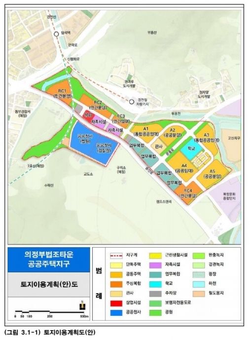 의정부 법조타운내 공공청사(파란색)와 공동주택 등이 표시된 토지이용계획안 ⓒ의정부시 제공