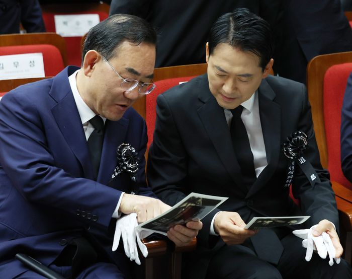장동혁 국민의힘 대표(오른쪽)와 주호영 국회부의장이 21일 오전 서울 동작구 국립서울현충원 현충관에서 열린 김영삼 대통령 서거 10주기 추모식에 참석해 대화를 하고 있다. ⓒ뉴시스