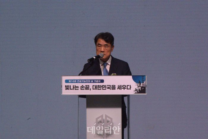 건설근로자공제회가 제16회 ‘건설기능인의 날’ 기념식을 21일 가빈아트홀에서 개최했다. 권혁태 건설근로자공제회 이사장 직무대행이 인삿말을 하고 있다. ⓒ건설근로자공제회