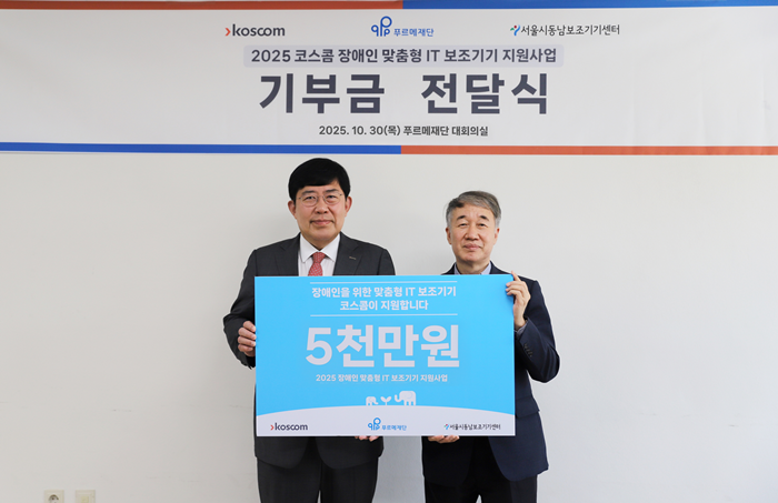 코스콤이 ‘장애인 맞춤형 IT 보조기기 지원사업’을 통해 장애인 자립과 삶의 질 향상에 힘쓰고 있다. 윤창현 코스콤 사장(왼쪽)이 ‘2025 코스콤 장애인 맞춤형 IT 보조기기 지원사업 전달식’에서 백경학 푸르메재단 상임이사와 기념촬영을 하고 있다. ⓒ코스콤