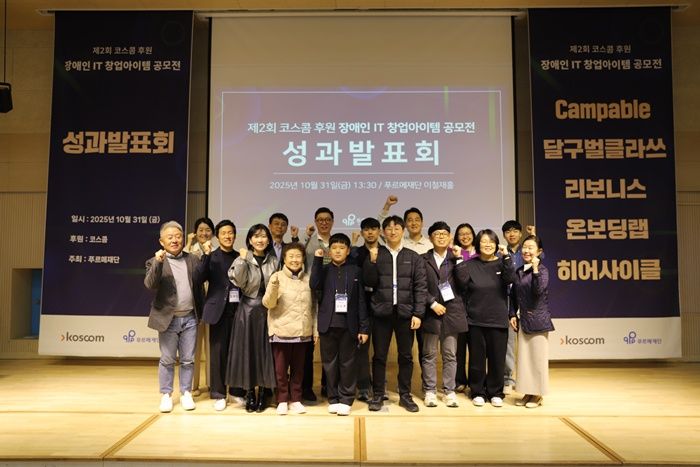 올해 10월 31일 열린 ‘제2회 코스콤 후원 장애인 IT 창업아이템 공모전’ 성과 발표회에서 참석자들이 기념촬영을 하고 있다. ⓒ코스콤