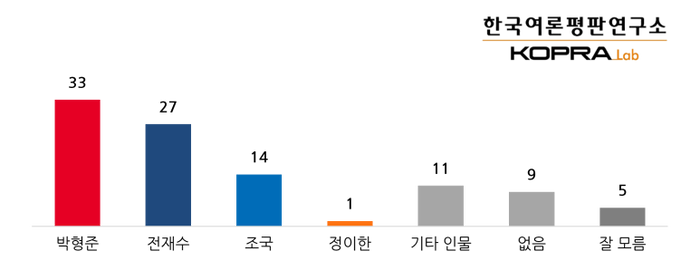 26일 한국여론평판연구소(KOPRA)가 지난 22~23일 이틀 간 무선 가상번호(85%)와 유선RDD(15%)를 이용한 ARS조사 방식으로 부산 지역 내 자체 조사를 실시해 발표한 결과, 박형준 시장이 33% 지지율을 얻어 선두를 달렸다. 전재수 장관(27%)과의 격차는 6%p로 오차범위 내 접전을 벌였다.