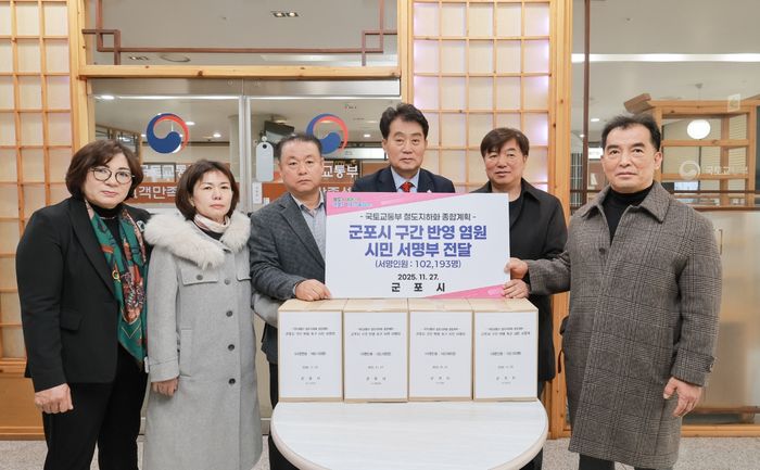경기 군포시는 하은호 군포시장이 27일 세종정부청사 국토교통부를 방문해 철도지하화를 국가철도망구축계획에 반영해 달라는 내용의 군포시민 서명부를 전달했다고 밝혔다. 이번 서명에는 총 10만2193명의 시민이 참여했다.