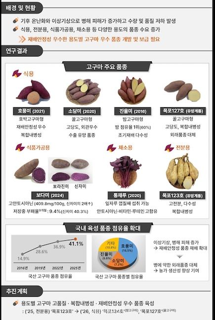 농진청은 기후변화 대응형 고품질 품종 육성과 가공·수출 산업화를 병행해 2030년까지 국산 고구마 점유율을 50% 수준까지 끌어올린다는 목표다. 이를 위해 재배 안정성이 우수한 용도별 맞춤 품종 개발, 고구마 생산 거점 단지 조성, 정식기와 복합 수확기 개발 등 기계화 생산 기반 확충을 중점 추진하고 있다.
