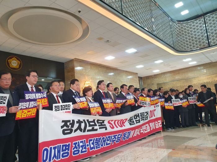 이후 체포동의안이 표결에 부쳐지자 국민의힘 의원 전원은 본회의장을 퇴장해 로텐더홀에 집결했다. 이 곳에서 '정치보복 불법수사 특검규탄' '정의 파괴집단 불법특검 해체'라는 피켓을 든 의원들은 이재명 정권과 민주당, 내란 특검을 향한 규탄대회를 열었다.