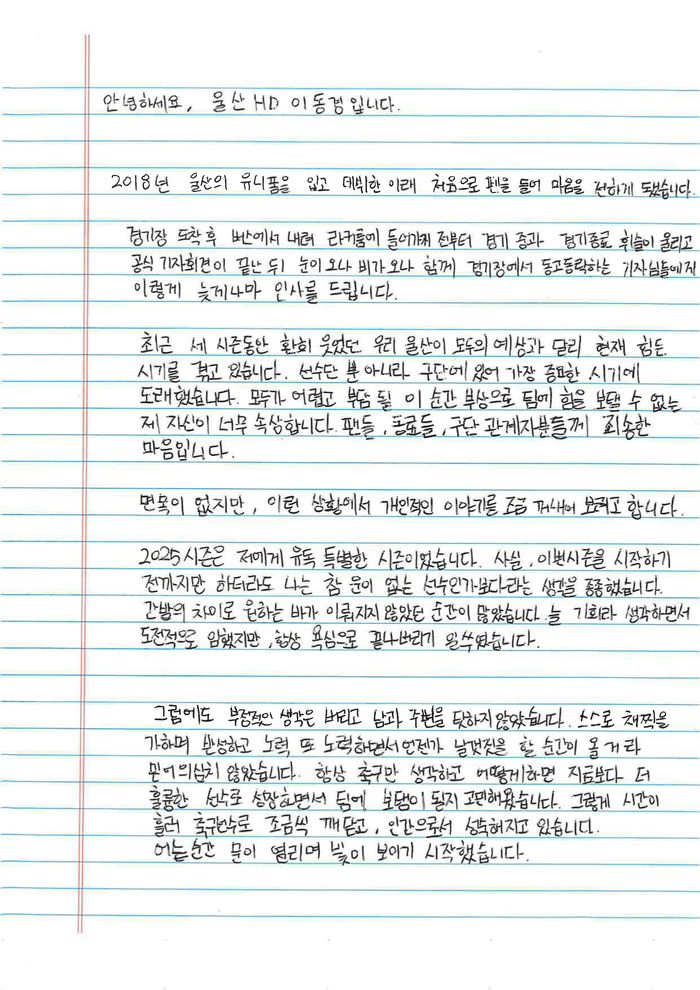 2025시즌 프로축구 K리그1 최우수선수(MVP) 후보에 오른 이동경(울산 HD)이 최종전을 앞두고 손 편지를 썼다.