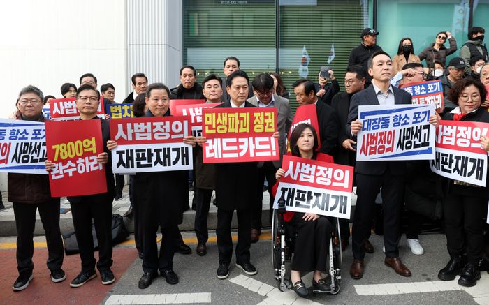 이어 "이 대통령은 대장동 공범들이 몽땅 감옥에 가니까, 검찰 항소를 포기시켰다"며 "국민에게 돌아가야 할 범죄 수익금 7800억원이 이재명 일당 다섯 명의 주머니로 들어간 것"이라고 지적했다.