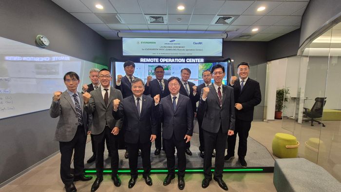 최종웅 삼성중공업 자율운항연구센터장(왼쪽 4번째)과 론 후앙 에버그린 선박사업부 부서장(왼쪽 3번째), 켄지 타카미 일본 NK선급 대만 지역 매니저(왼쪽 2번째) 등 관계자들이 SROC 개소 기념촬영을 하고 있다.ⓒ삼성중공업