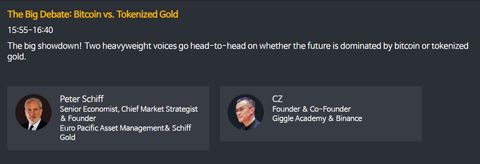 창펑 자오 바이낸스 창업자(CZ)와 월가의 대표적인 비트코인 회의론자이자 금 강세론자인 피터 쉬프 유로퍼시픽캐피탈 최고경영자(CEO)가 4일(현지시간) '비트코인 대 토큰화된 금(Bitcoin vs. Tokenized Gold)'을 주제로 가치 저장 수단으로서의 미래에 대해 토론을 벌인다. ⓒ바이낸스