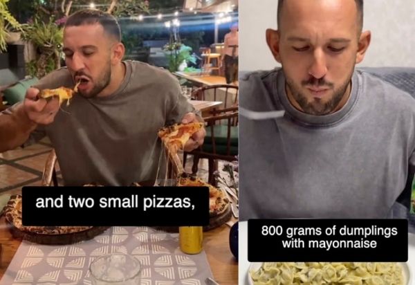 아침에는 페이스트리 한 접시와 케이크 반쪽을 먹었고 점심에는 만두 800g에 마요네즈를 곁들였다. 저녁에는 햄버거와 피자 스몰 사이즈 두 판을 시켰고 틈 날 때마다 감자칩을 간식으로 먹었다.