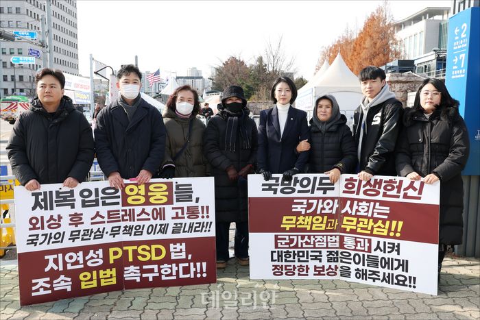 배현진 국민의힘 의원이 2일 오전 서울 여의도 국회 정문 앞에서 제2연평해전 국가유공자 고 한상국 상사의 아내 김한나 씨와 제1연평해전 참전자인 김무상, 선정오 씨 등과 지연성 PTSD 법 입법 촉구 1인 시위에 동참하고 있다.