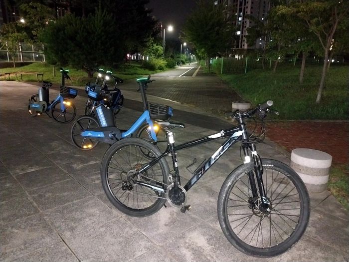 최근 양주시 옥정 2동 도로변 횡단보도 바로 앞에 전기자전거가 무단 방치돼 야간 보행자의 안전을 위협하고 있는 모습.ⓒ데일리안 오명근 기자