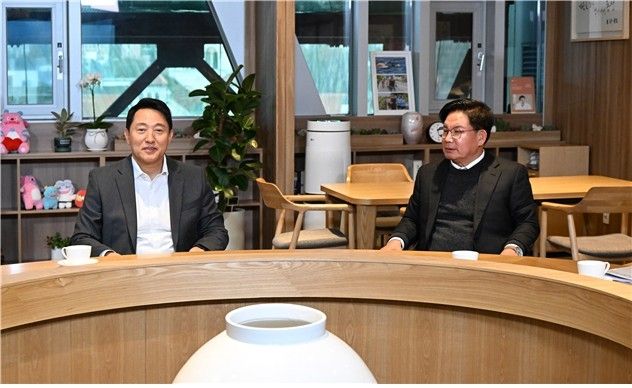 오세훈 서울시장은 3일 박강수 마포구청장을 만나 지역 현안 사업과 시민 편의시설 건립에 관해 논의했다.