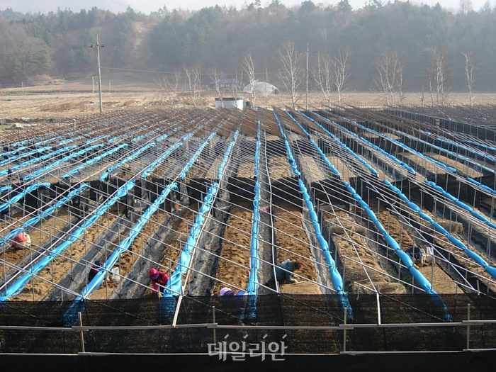차광망을 말아놓은 인삼밭. ⓒ농촌진흥청