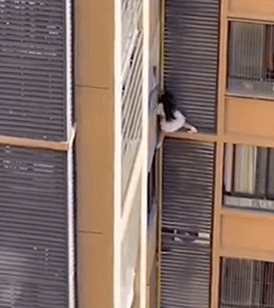 영상 속 여성은 상의를 벗은 한 남성과 대화를 나누다 남성이 사라지자 건물 외벽 배관과 창틀을 잡고 아래층으로 내려가기 시작한다.