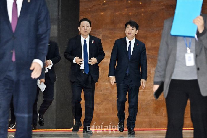 김병기 더불어민주당 원내대표가 9일 오후 서울 여의도 국회에서 열린 더불어민주당 비공개 의원총회에서 최근 '인사청탁 문자'로 논란이 된 문진석 더불어민주당 원내운영수석부대표 등과 의총장으로 향하고 있다.