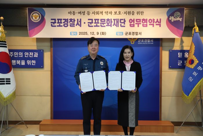 경기 군포경찰서는 9일 군포문화재단(대표이사 전형주)과 아동·여성 등 범죄피해자 보호·지원 및 지역 문화예술 발전을 위한 업무협약을 체결했다고 밝혔다.