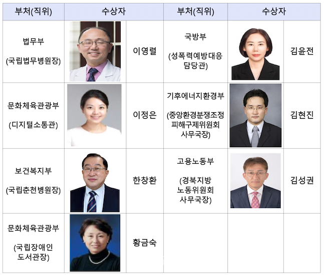 표창 대상자는 법무부, 문화체육관광부, 국방부, 보건복지부, 고용노동부 등 다양한 부처에서 근무 중인 국장급 3명과 과장급 4명, 그리고 제도운영 유공자 2명이다. 공통된 점은 각자의 전문분야를 행정현장에 접목해 정책성과를 높였다는 것이다.