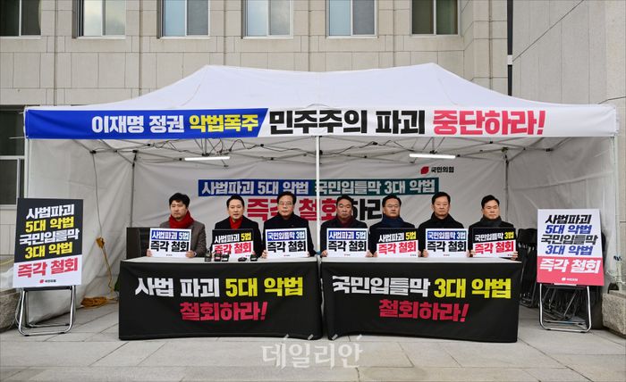 국민의힘 장동혁 대표와 송언석 원내대표 등이 10일 오전 서울 여의도 국회 본청 앞에 설치된 '8대 악법 저지' 릴레이 천막 농성장에서 농성을 하고 있다.