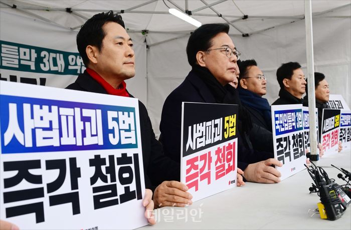 국민의힘 장동혁 대표와 송언석 원내대표 등이 10일 오전 서울 여의도 국회 본청 앞에 설치된 '8대 악법 저지' 릴레이 천막 농성장에서 농성을 하고 있다.
