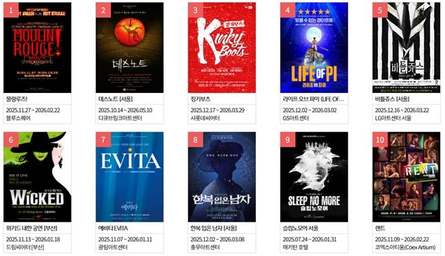 서울에선 ‘물랑루즈!’을 비롯해 ‘데스노트’ ‘킹키부츠’ ‘라이프 오브 파이’ ‘비틀쥬스’ ‘에비타’ ‘한복 입은 남자’ ‘슬립노모어’ ‘렌트’ ‘팬레터’ ‘보니앤클라이드’ ‘슈가’ 등이 공연되고 있고, 서울 공연을 성황리에 마무리한 ‘위키드’ 내한 공연도 부산에서 진행되고 있다. 이들 작품의 흥행 성적을 종합해 볼 때, 2025년 전체 뮤지컬 시장 규모는 KOPIS 집계 이래 사상 최초로 5000억 원을 무난히 돌파할 것으로 전망되고 있다.