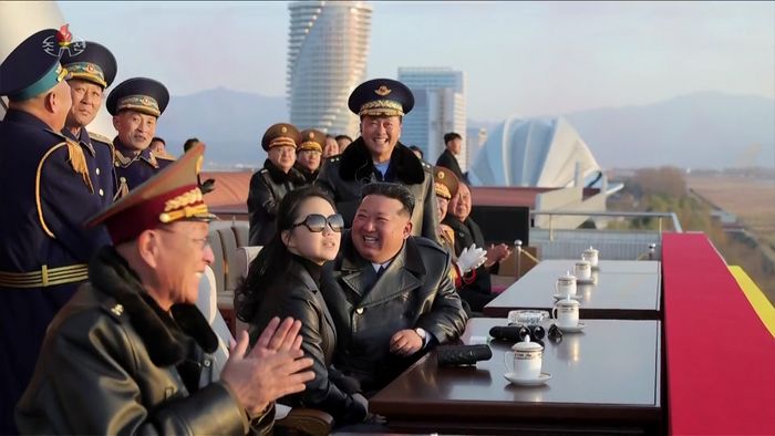 김정은 국무위원장이 지난 11월 28일 제2공군사단 59길영조영웅연대 갈마비행장에서 진행된 조선인민군 공군창설 80돌 기념행사에 참석했다고 조선중앙TV가 30일 보도했다. 이번 행사에는 딸 주애가 동반했다. ⓒ뉴시스
