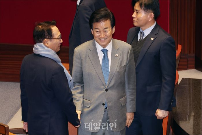 정동영 통일부 장관이 12일 오후 서울 여의도 국회 본청에서 열린 국회 본회의에서 '형사소송법 일부개정법률안(대안)'에 대한 무제한토론 중단 표결에 참여한 뒤 동료 의원들과 인사를 나누고 있다.