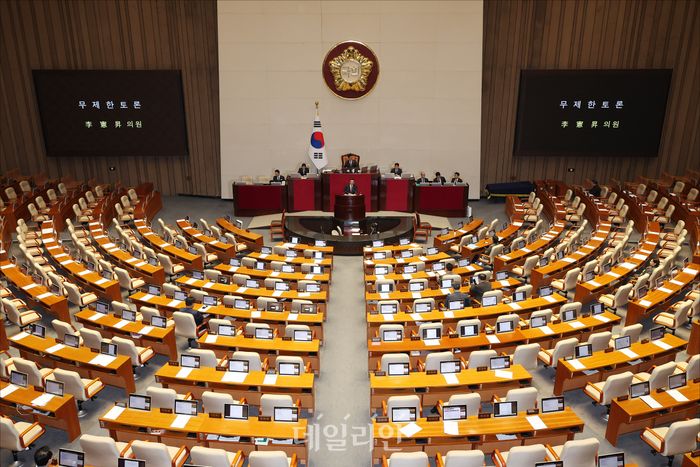 이헌승 국민의힘 의원이 12일 오후 서울 여의도 국회 본청에서 열린 국회 본회의에서 '은행법 일부개정법률안'에 대한 무제한토론(필리버스터)을 하고 있다.