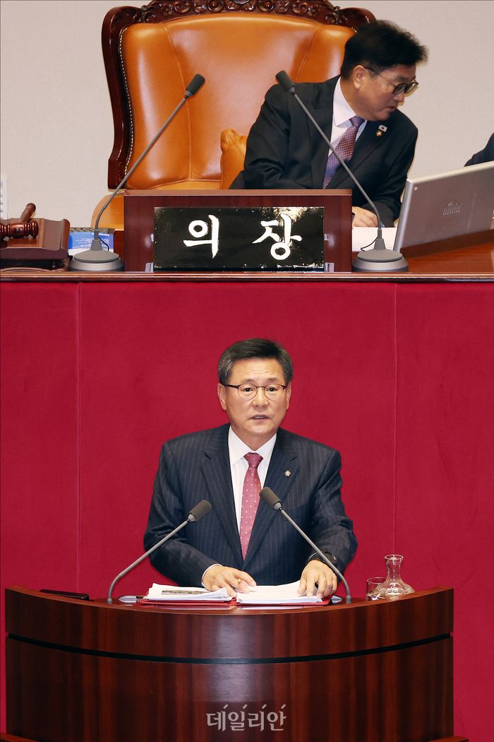 이헌승 국민의힘 의원이 12일 오후 서울 여의도 국회 본청에서 열린 국회 본회의에서 '은행법 일부개정법률안'에 대한 무제한토론(필리버스터)을 하고 있다.