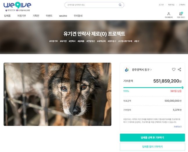지역 기부도 있지만 지정기부도 눈여겨 보자. 각 지역에서 현안 사업을 후원하는 내용도 있고, 유기견 보호 캠페인 등 눈길이 가는 사업들이 많다. 사진은 광주 동구에서 추진 중인 유기견 안락사 제로 프로젝트 메인화면. ⓒ위기브