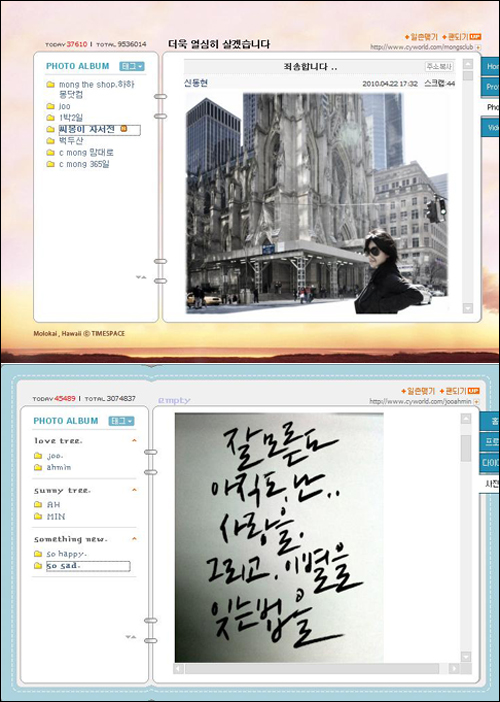 22일 결별 사실이 알려진 MC몽과 주아민(아래)의 미니홈피