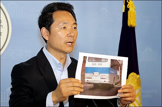 민주통합당 총선 전남 고흥,보성 지역 경선에서 패배한 장성민 예비후보가 20일 국회 정론관에서 경선에서 승리해 공천이 확정된 김승남 후보의 관광버스 등 차떼기 동원 의혹을 제기하고 있다.